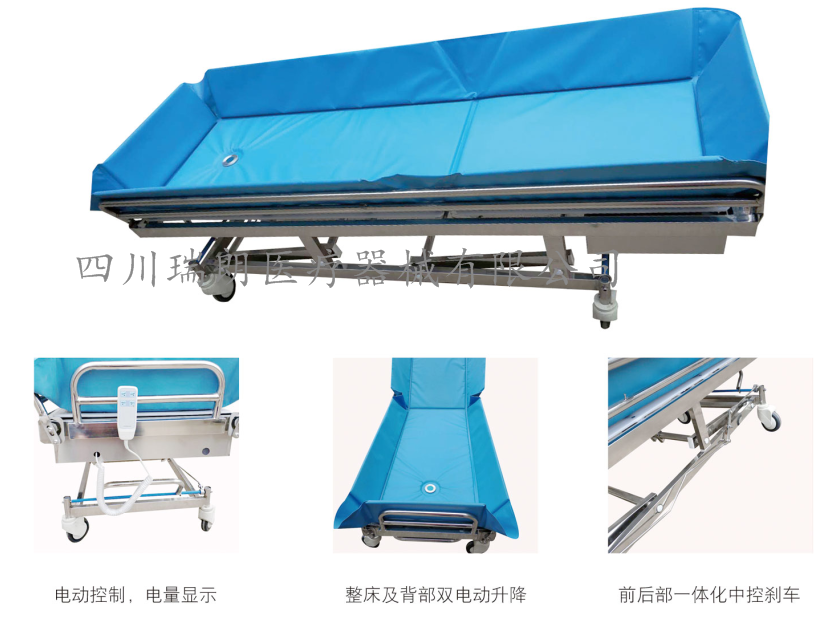 規(guī)格參數(shù):防水雙電機(jī)整床及背部都可輕松升降,增加舒適性,使用者及護(hù)理人員都更輕松便利。 內(nèi)藏式防水電機(jī)及控制盒(電池容量2.6AH)電量多少可直觀顯示,電機(jī)參數(shù):電機(jī)最大推力6000N 輸入電壓;24V 行程(MM)100-400 可選 過(guò)載保護(hù):有 防水等級(jí);IP66 認(rèn)證標(biāo)準(zhǔn):CE/LL60601/EN60601 2. 床架;材質(zhì)為國(guó)際304#不銹鋼,尺寸 長(zhǎng)1960mm 款650m 高470-770mm 可根據(jù)客戶要求尺寸可定做;承重≦160kg 3.進(jìn)口高品質(zhì)中控剎車(chē)系統(tǒng),前后都有一體式剎車(chē),踩下4輪全剎車(chē),抬起自由推行,移動(dòng)方便,操作簡(jiǎn)單,性能可靠。 4.床墊:采用高韌性環(huán)保聚氯乙烯制成,內(nèi)內(nèi)夾高密度EVA 柔軟舒適,可拆下清潔消毒。 4.護(hù)欄:護(hù)欄高200mm 二側(cè)護(hù)欄皆可輕松放下,易于洗澡者移動(dòng)搬運(yùn)